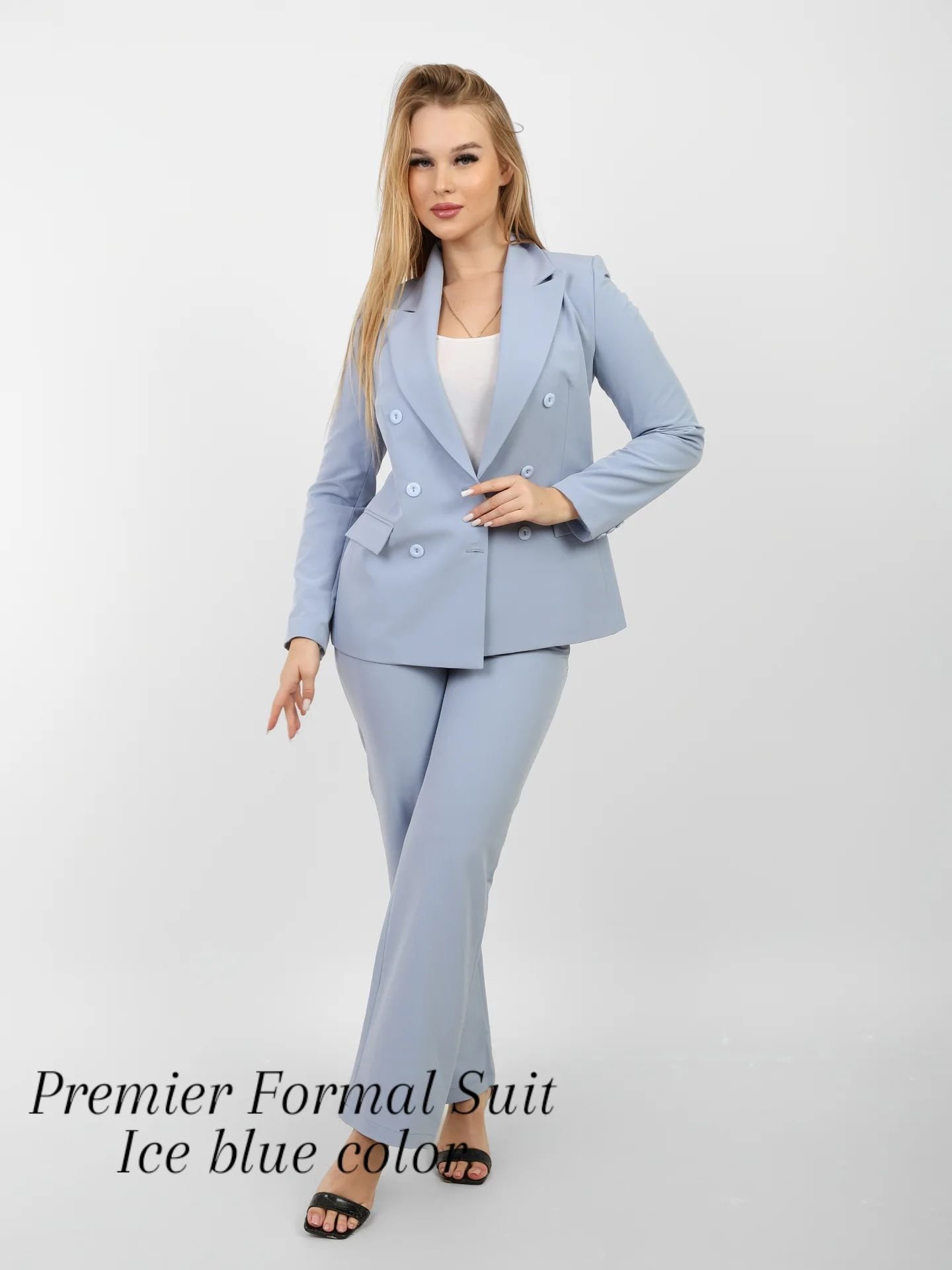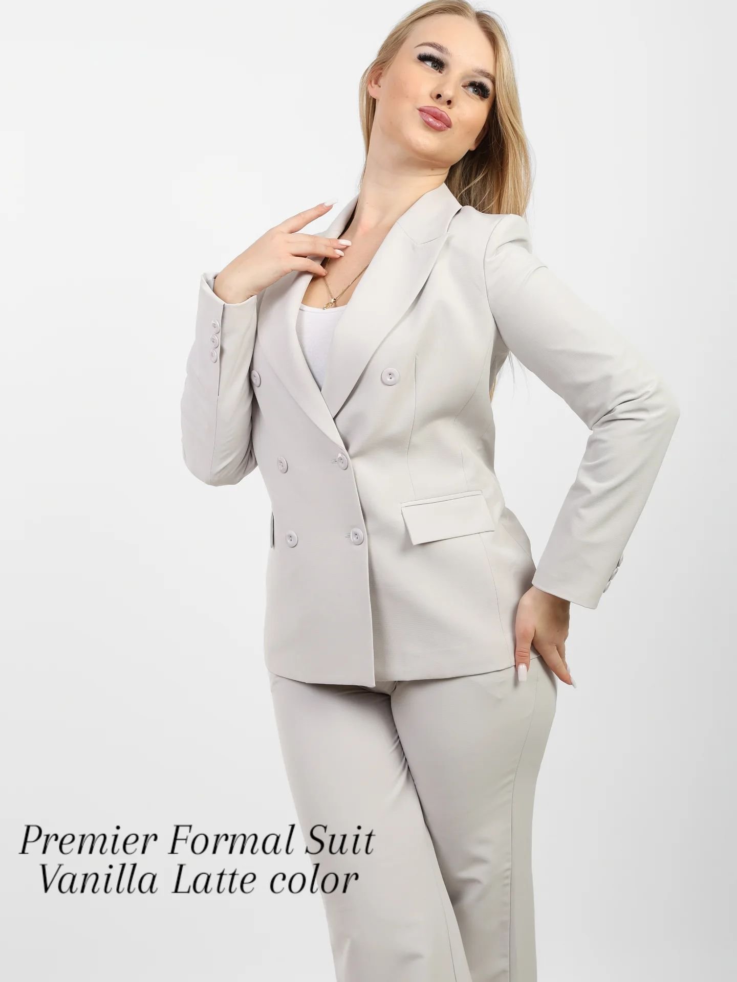 Blazer: A sophisticated double-breasted design with a pointed lapel that accentuates the shoulders and creates a flattering silhouette. It features six classic buttons and flap pockets for added practicality and style.